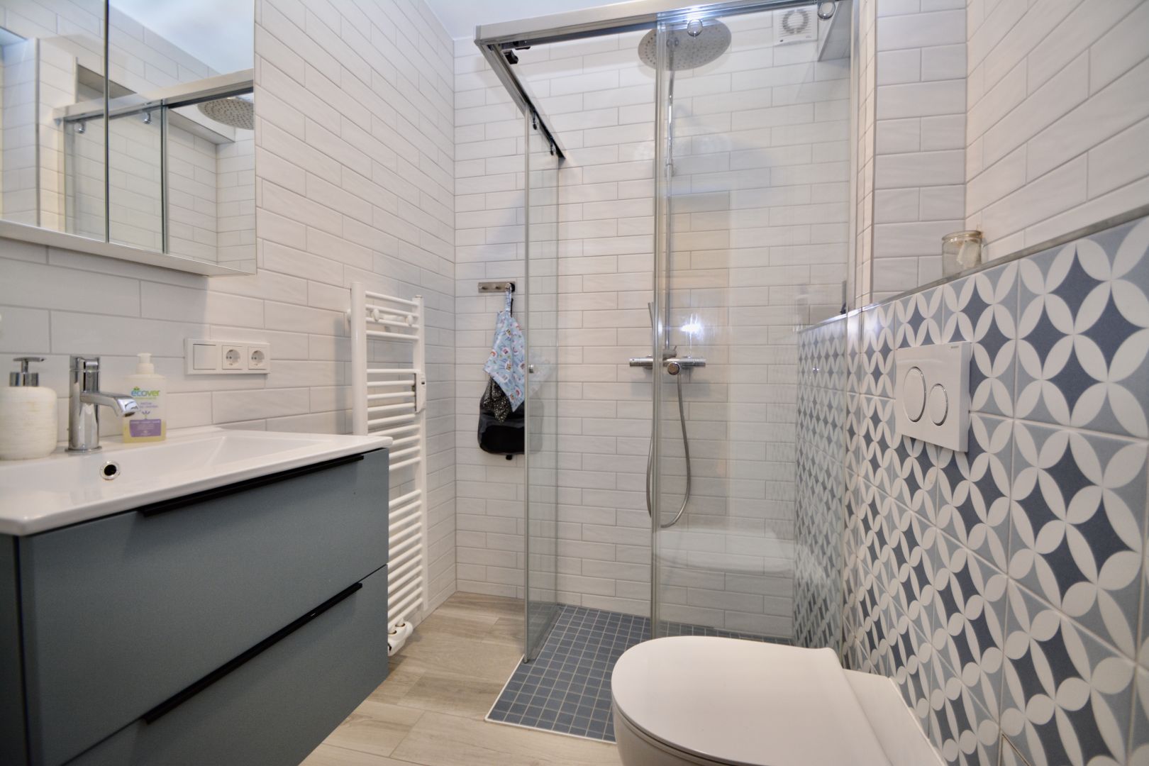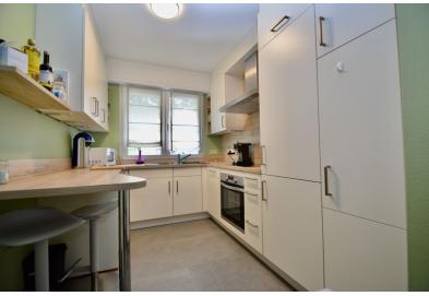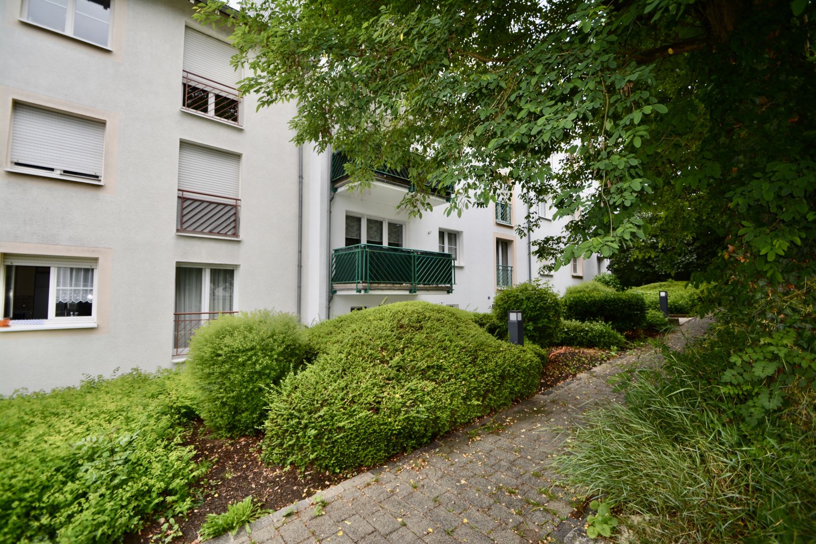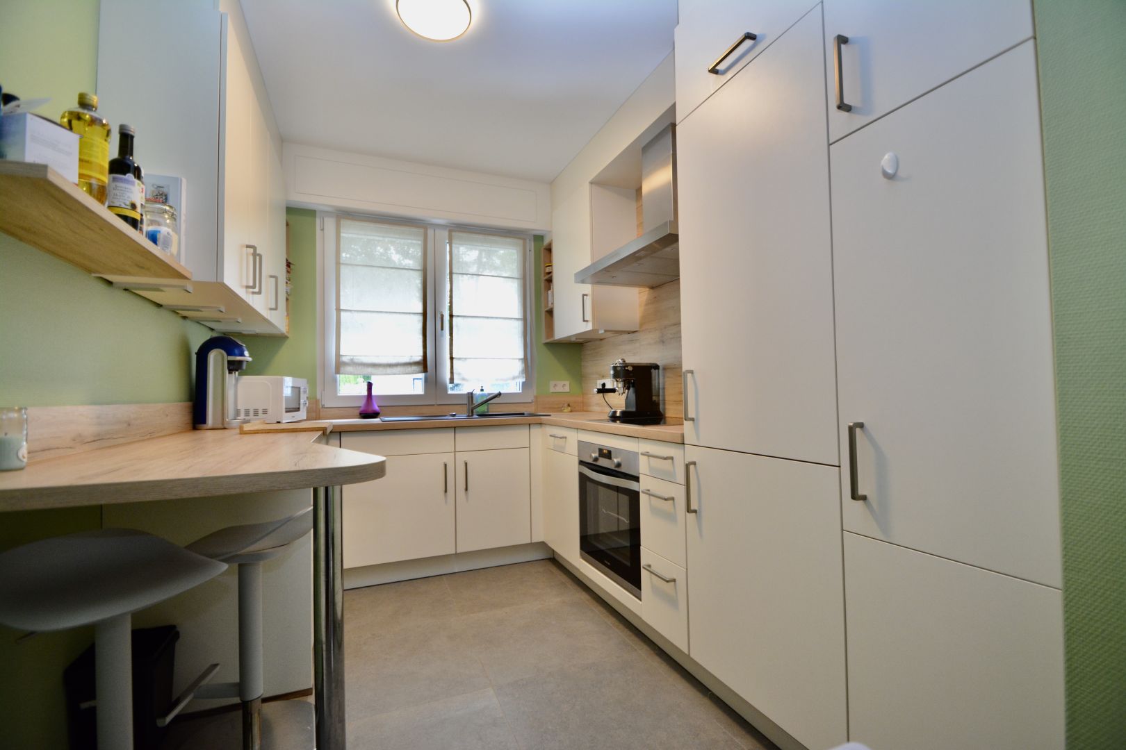 L'appartement se compose d'un hall d'entrée desservant un séjour lumineux avec accès direct à un balcon de 5 m², d'une cuisine équipée séparée, d'une chambre à coucher ainsi que d'une salle de douche. L'ensemble est complété par une cave privative au sous-sol et un garage fermé situé à l'arrière du bâtiment.