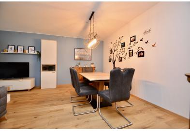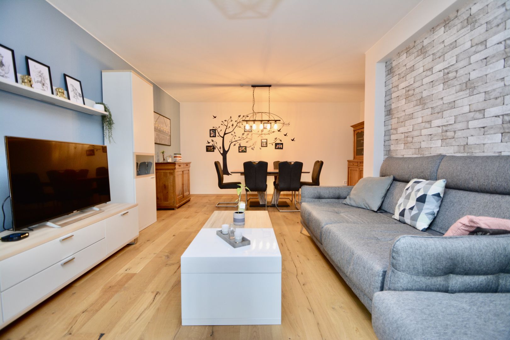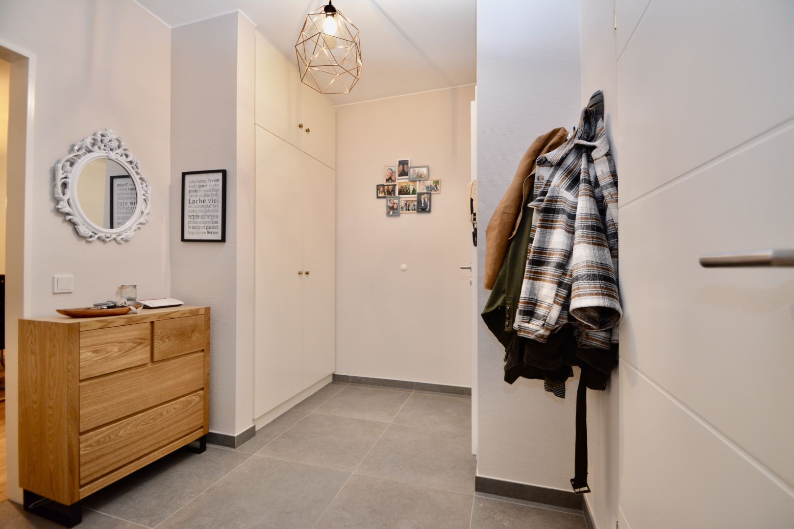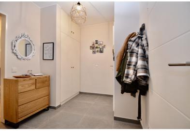 L'appartement se compose d'un hall d'entrée desservant un séjour lumineux avec accès direct à un balcon de 5 m², d'une cuisine équipée séparée, d'une chambre à coucher ainsi que d'une salle de douche. L'ensemble est complété par une cave privative au sous-sol et un garage fermé situé à l'arrière du bâtiment.