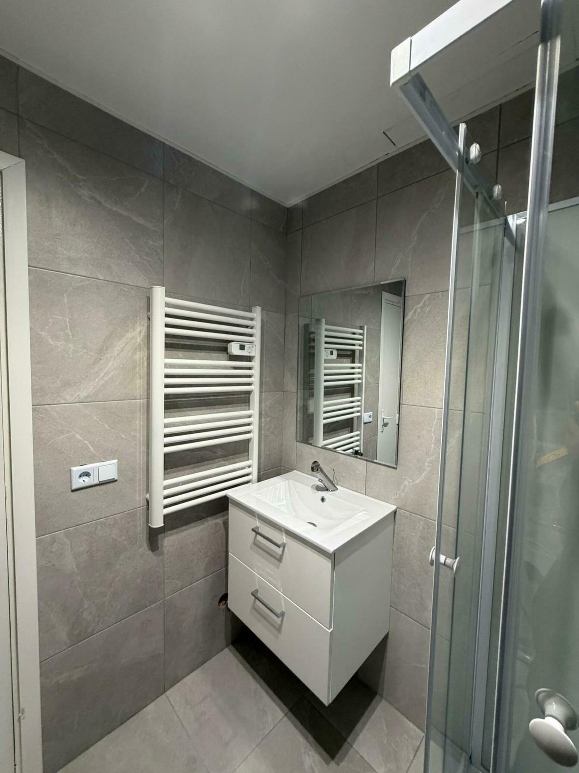 • Salle d'eau contemporaine avec douche et finitions soignées.